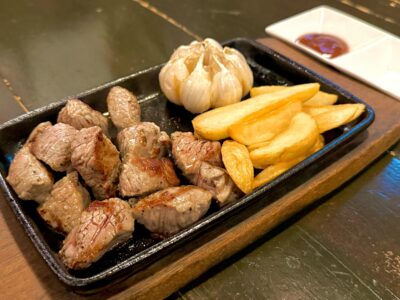 とても柔らかい食感と中はミディアムレアに仕上げ、にんにく丸ごと一つとポテトフライを添えております!