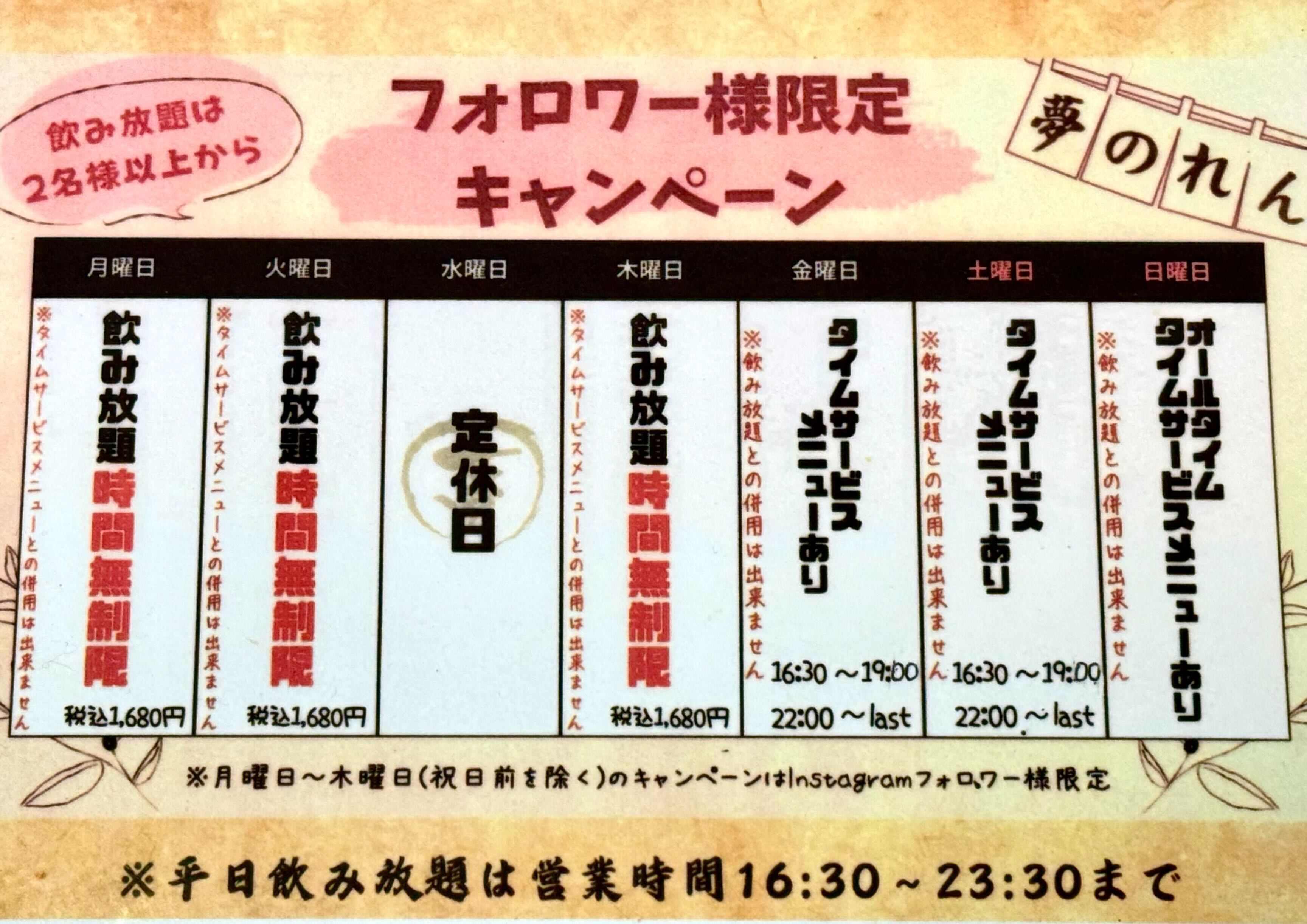 夢のれんでは日頃の感謝を込めて、毎日タイムサービスを開催中!