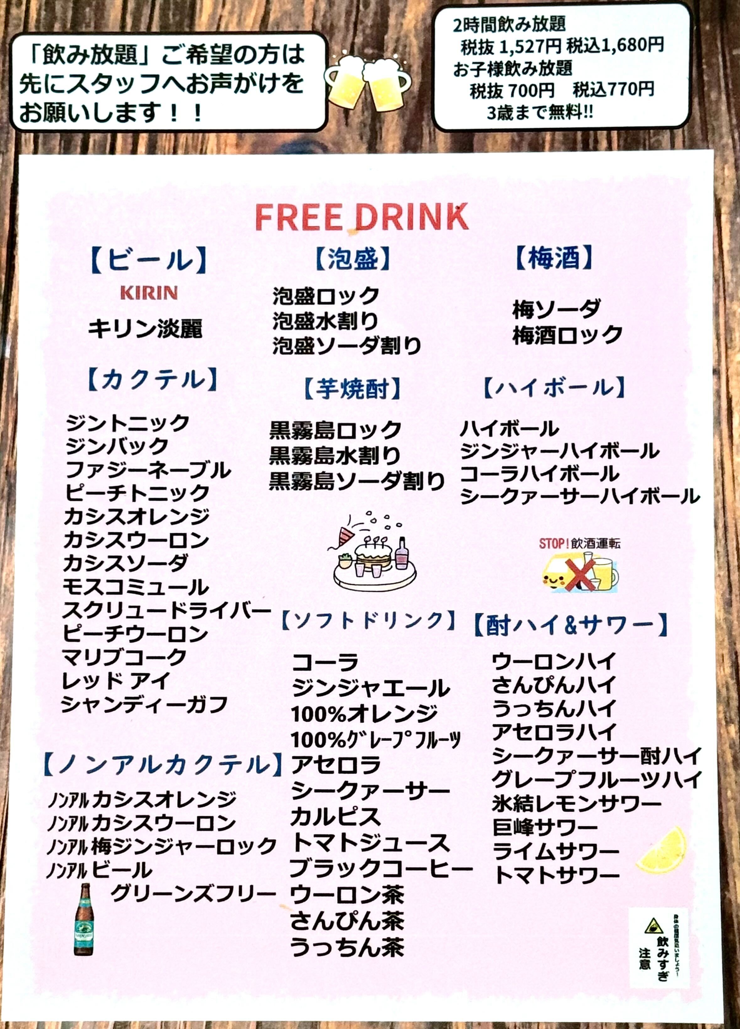 ☆3日前のご予約から受付☆3時間のゆったり飲み放題付き・料理七品の宴会向けコースです。お料理の詳細は店舗にお問合せ下さい。